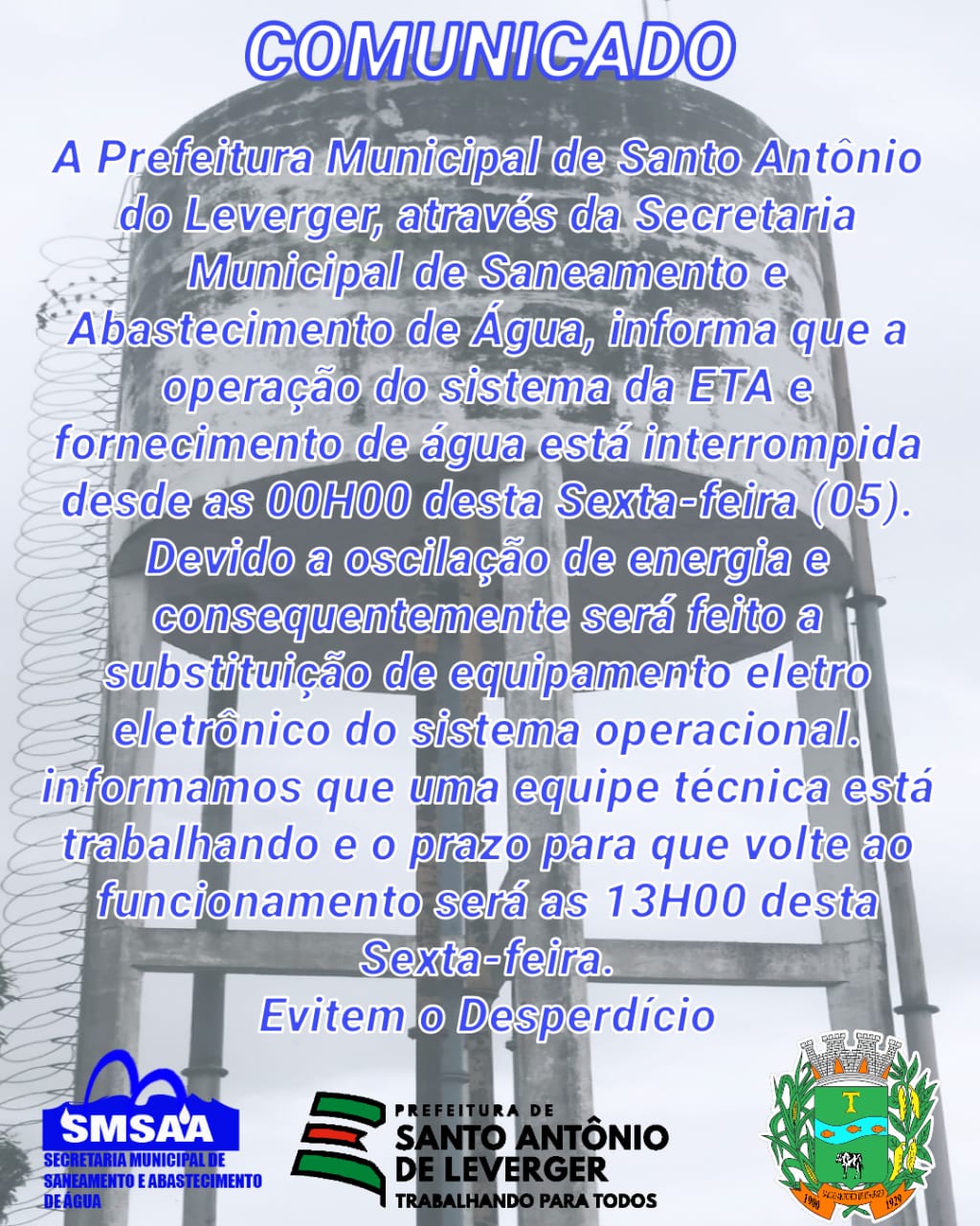 COMUNICADO - INTERROMPIMENTO DE ÁGUA DAS 00:00 Sexta Feira (05) Prazo que volte ate as 13:00 Sexta Feira (05)