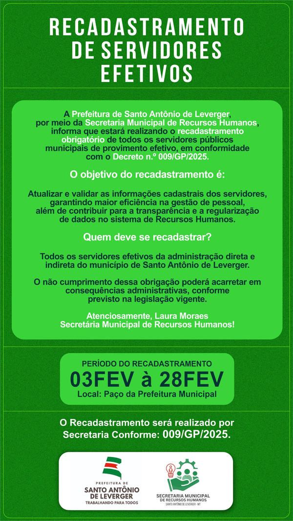 A Prefeitura de Santo Antônio de Leverger, por meio da Secretaria Municipal de Recursos Humanos, informa que estará realizando o recadastramento obrigatório, de todos os servidores públicos municipais de provimento efetivo, em conformidade com o Decreto n.° 009/GP/2025.