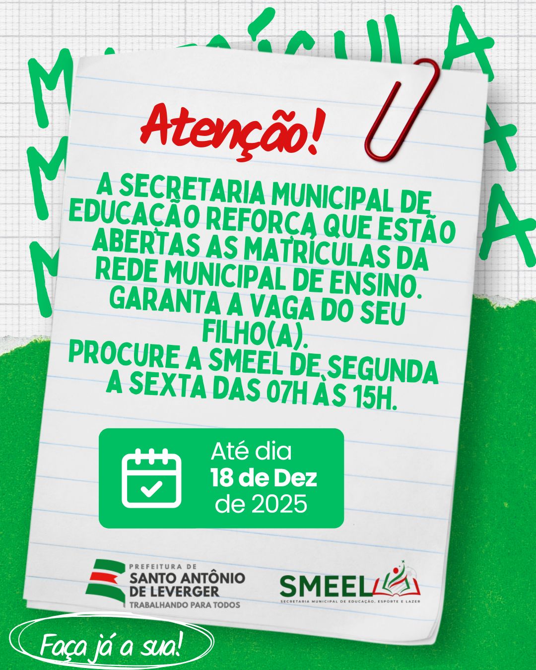 A Prefeitura de Leverger, por meio da Secretaria de Educação, Esporte e Lazer, comunica aos senhores pais ou responsáveis, de crianças que estão em idade escolar, da rede municipal de ensino, que tem até o dia 18.12.2025, para fazerem a matrícula de seus filhos, para o ano letivo de 2026.
