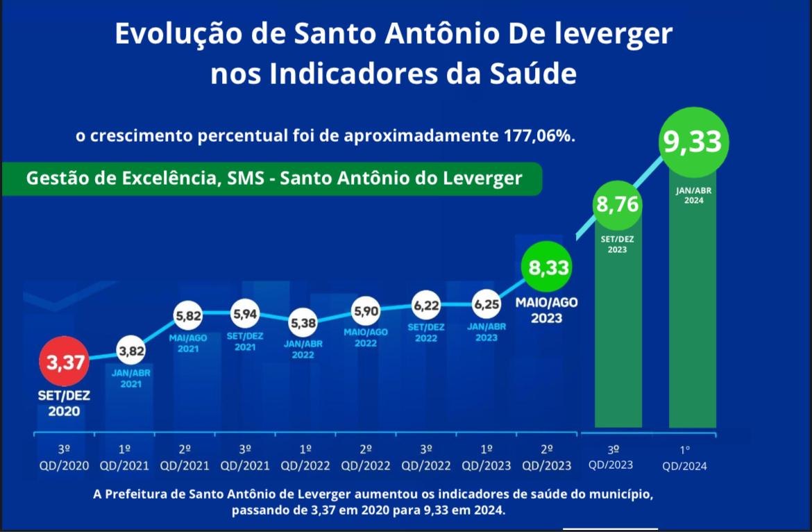 Em um levantamento feito pelo Ministério da Saúde, Santo Antônio de Leverger conquistou, a nota de 9,33 no índice do Previne Brasil, que mede a eficiência das ações realizadas na saúde pública. Com esse resultado, a cidade ocupa a 5ª posição no ranking de desenvolvimento da saúde na Baixada Cuiabana.