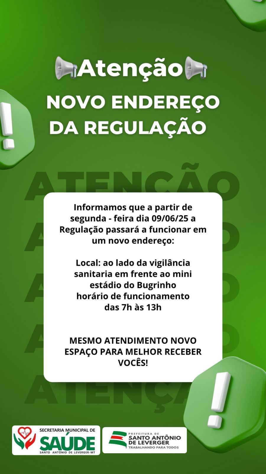 A Prefeitura de Leverger, informa que, a partir do dia 09.06.2025, o setor de Regulação da Saúde, passará atender em um novo endereço. Com objetivo de oferecer um espaço mais amplo e confortável, garantindo qualidade no atendimento à população.