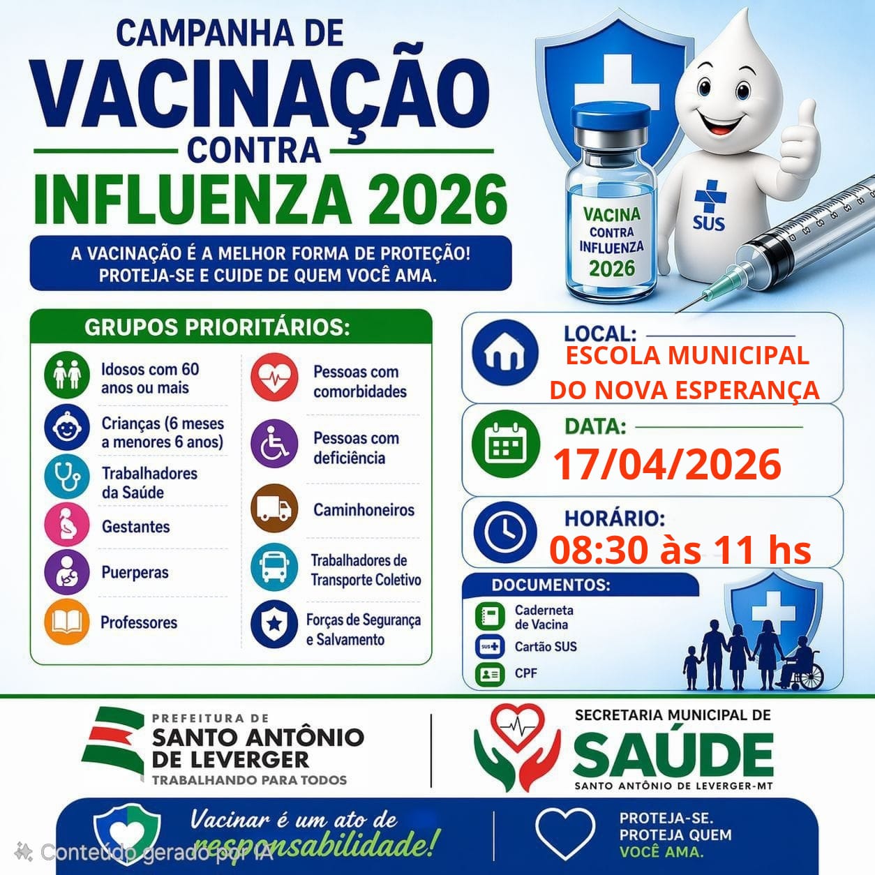 A administração municipal reforça o comunidade, para que a população procure os pontos de vacinação, conforme o calendário divulgado, levando documento pessoal e cartão de vacina. A imunização contra a Influenza, é considerada uma das principais formas de prevenção, contra complicações causadas pela gripe, especialmente entre idosos, crianças e pessoas com comorbidades.