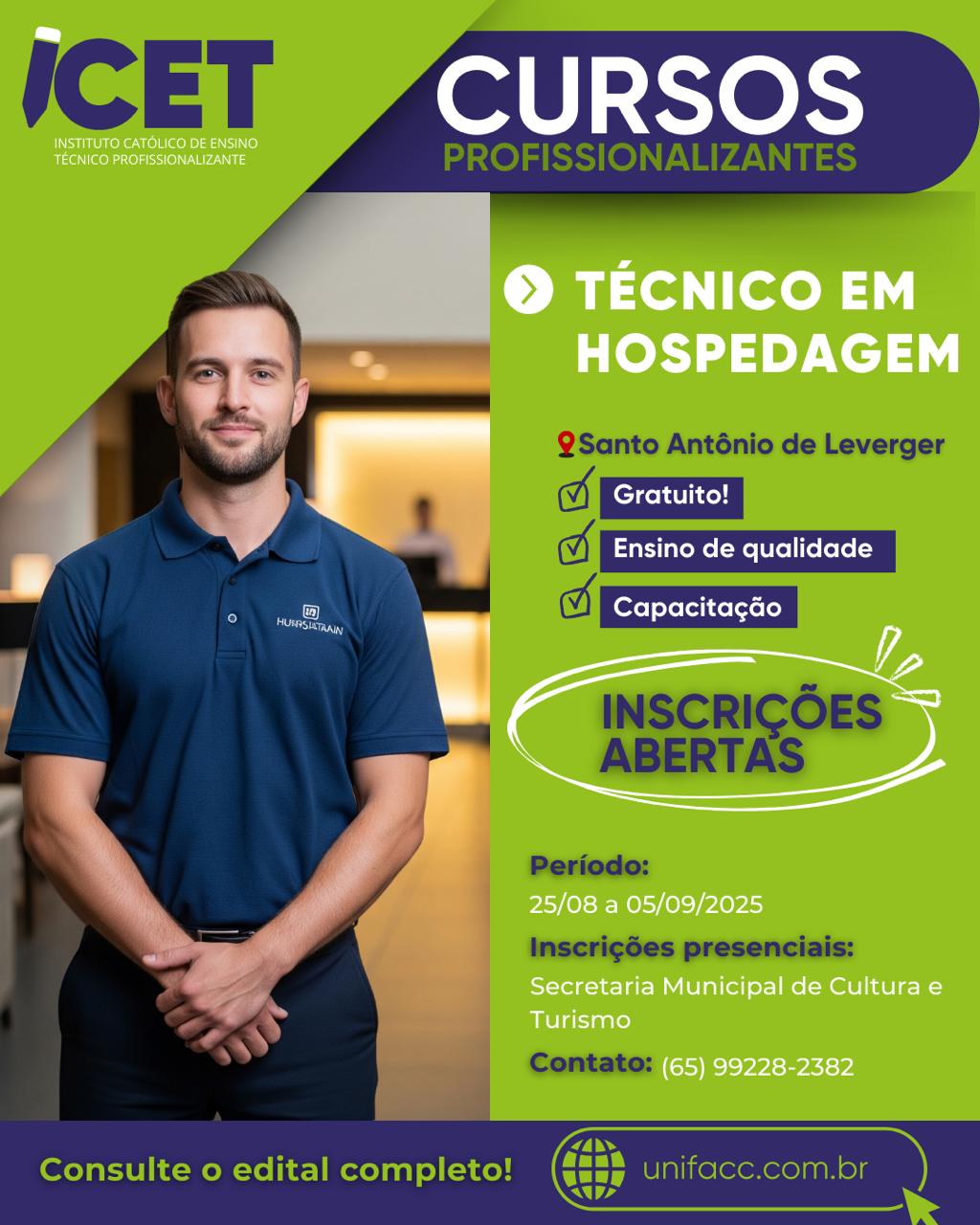Com a chegada de novos investimentos no município de Santo Antônio de Leverger, a Prefeitura, em parceria com o Instituto Católico de Ensino, está com inscrições abertas, para o curso de Hospedagem, no período noturno, na Escola Estadual Professora Oswaldita Elisa Teixeira.