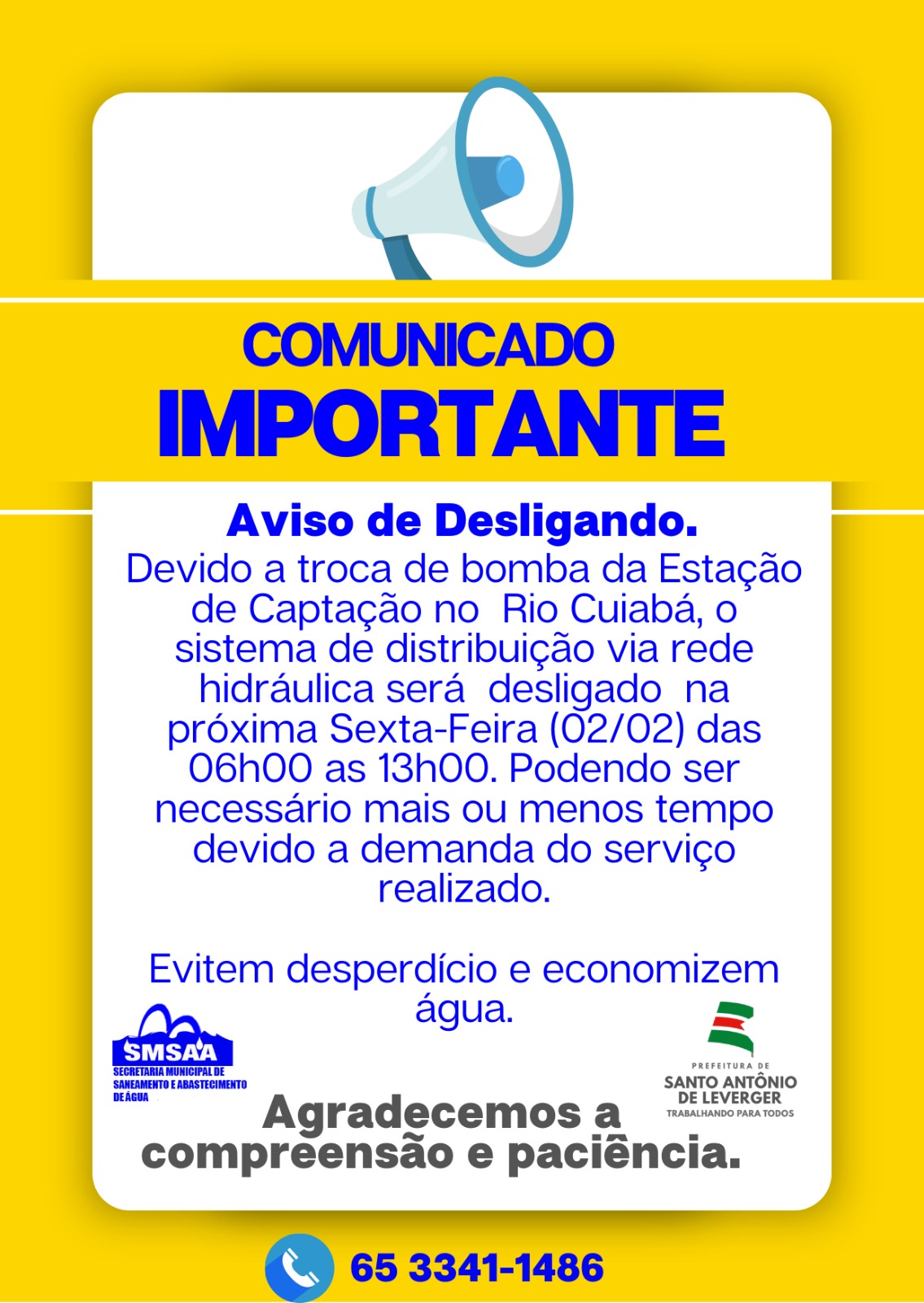 A Prefeitura de Leverger, por meio da Secretaria de Saneamento e Abastecimento de Água, emitiu um comunicado à população, para que evitem desperdícios de água nos próximos dias, quando será realizada a substituição da bomba de capitação no Rio Cuiabá.
