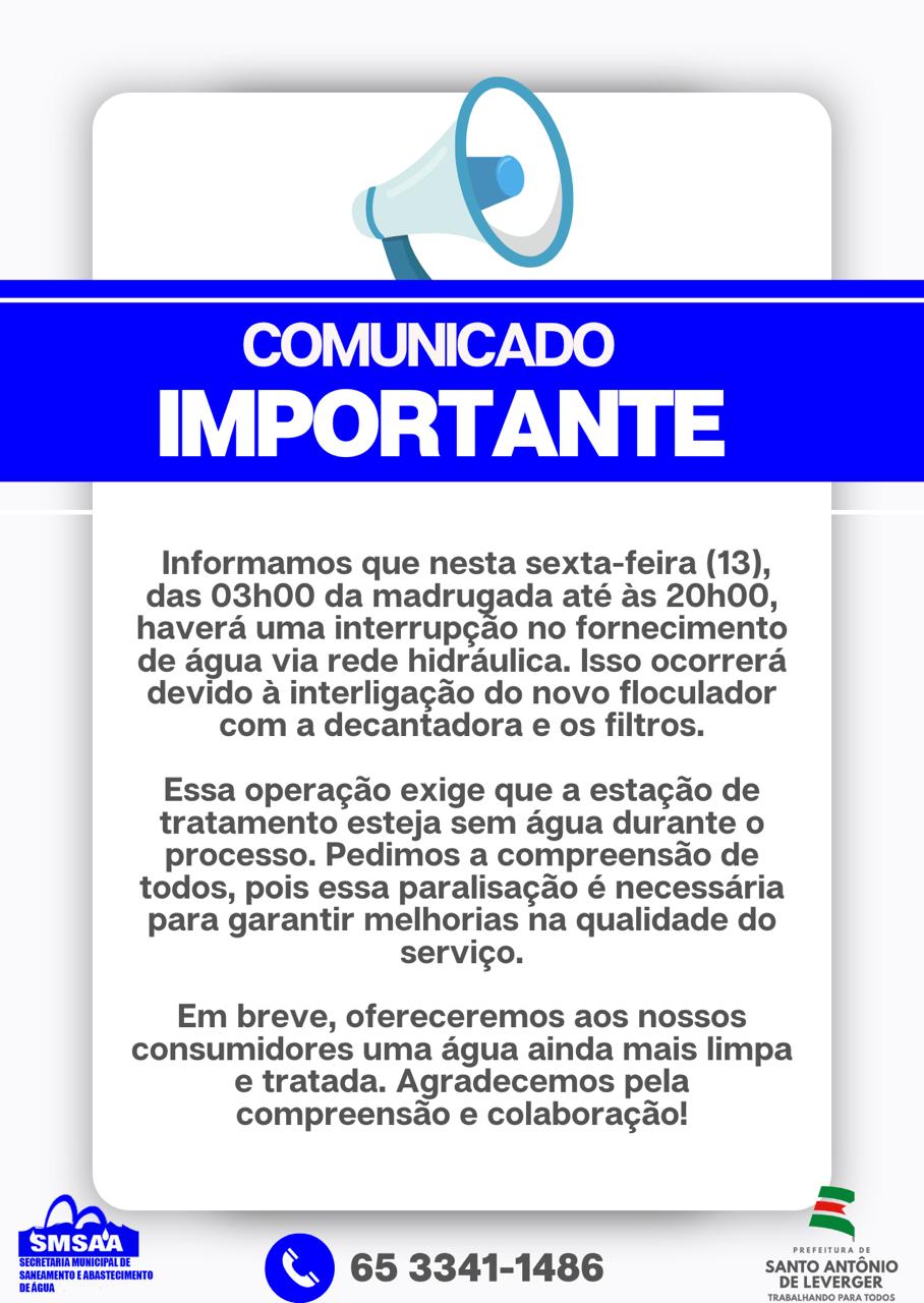 A Prefeitura de Leverger, por meio da Secretaria Municipal de Saneamento e Abastecimento de Água, irá suspender o fornecimento de água, para manutenção na Estação de Tratamento de Água (ETA), no próximo dia 13.12.2024.